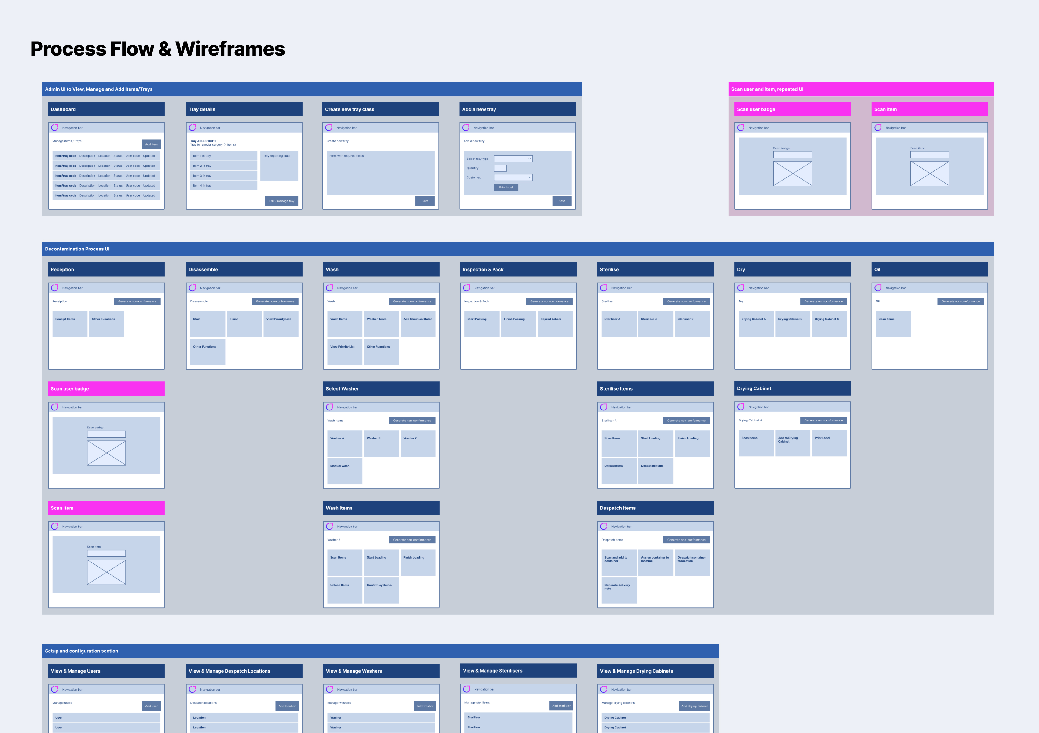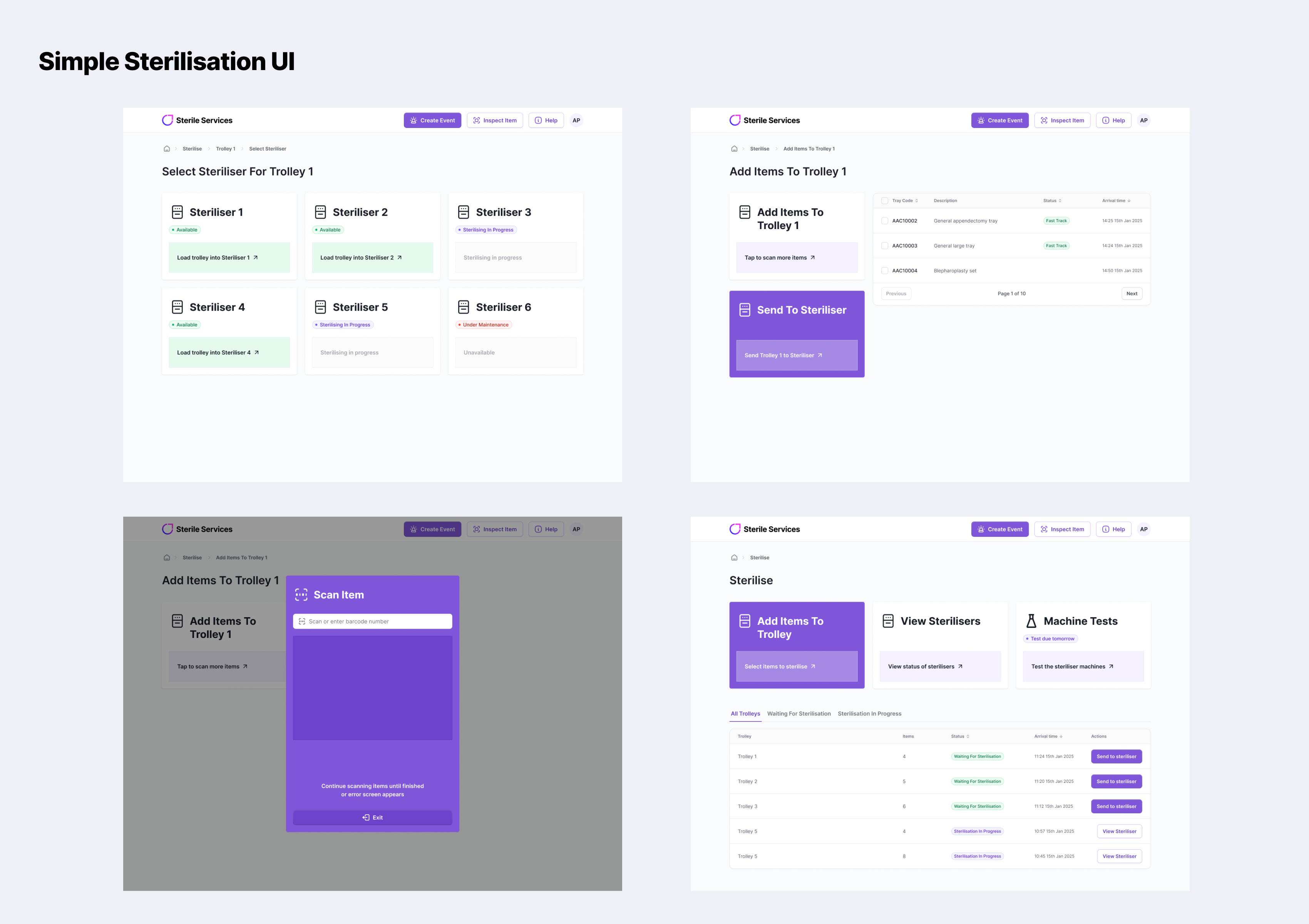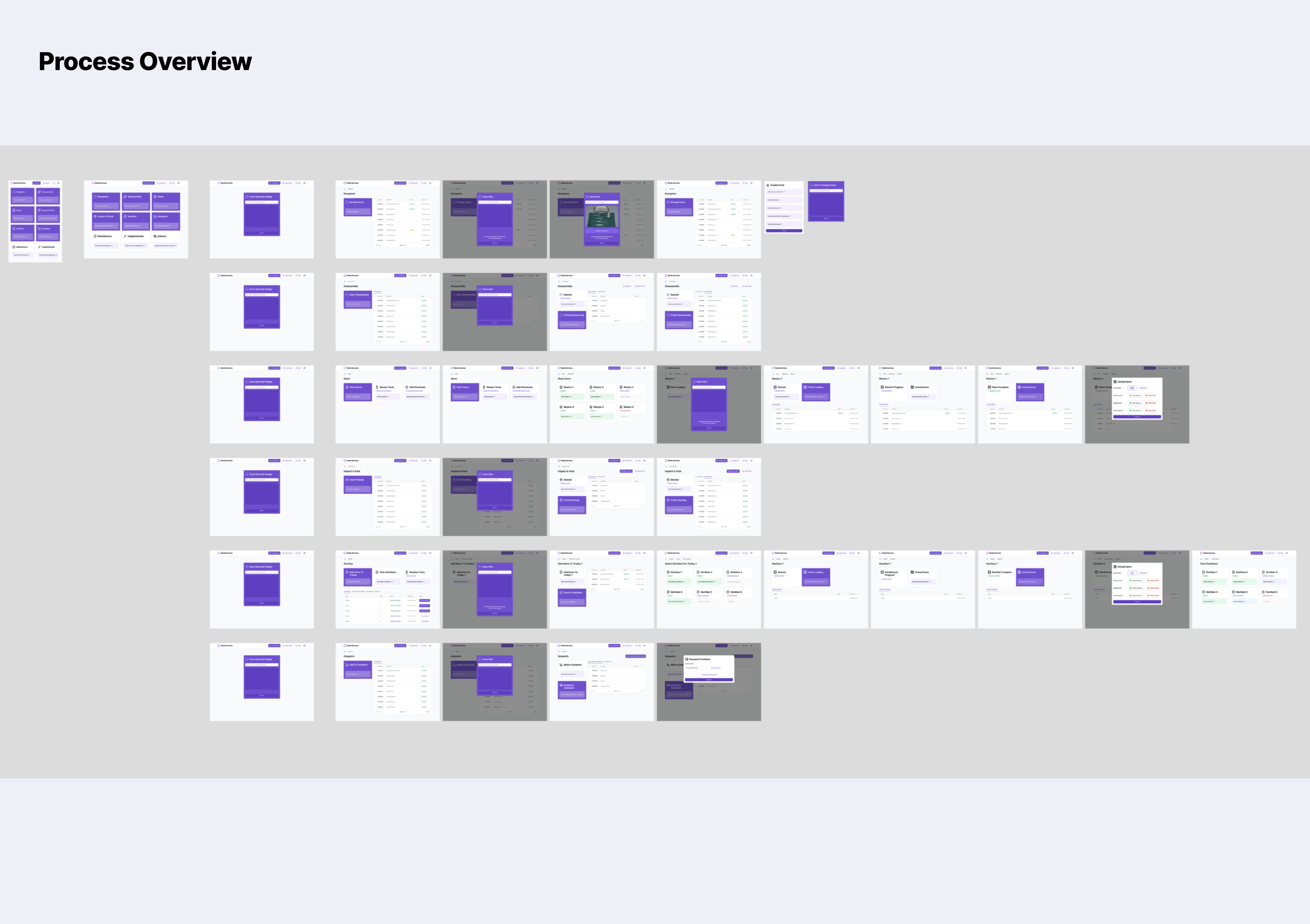 A key focus on the redesign and modernisation, was ensuring that all the flows were as simple and straightforward as possible - as they would be used in a cleaning room environment where workers go through a huge volume of equipment each day. Special attention was paid to the flows, to ensure they covered all the exact sterilisation requirements whilst being super clear to the user, and creating a simple and clean UI that would work responsively on a computer or tablet.