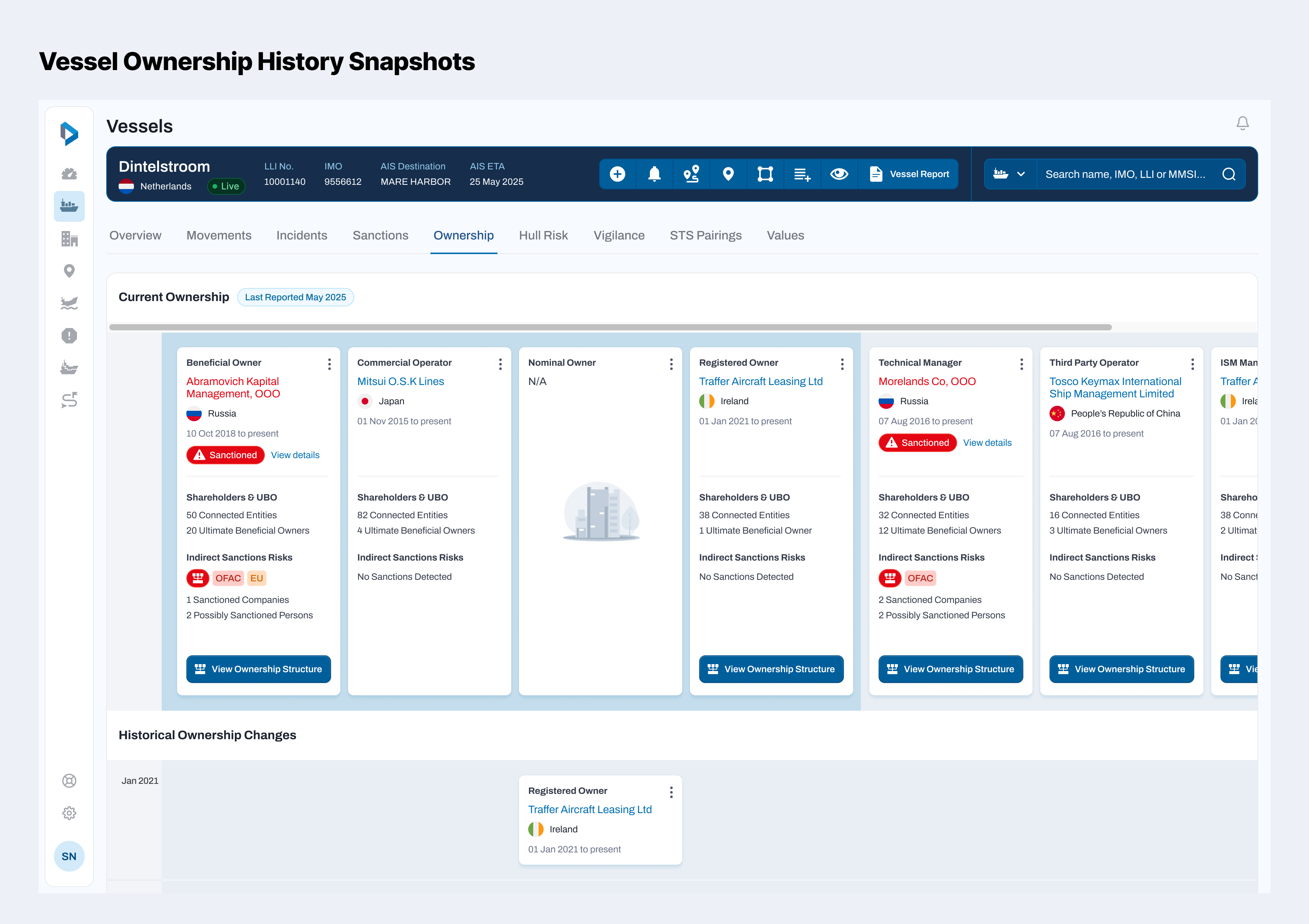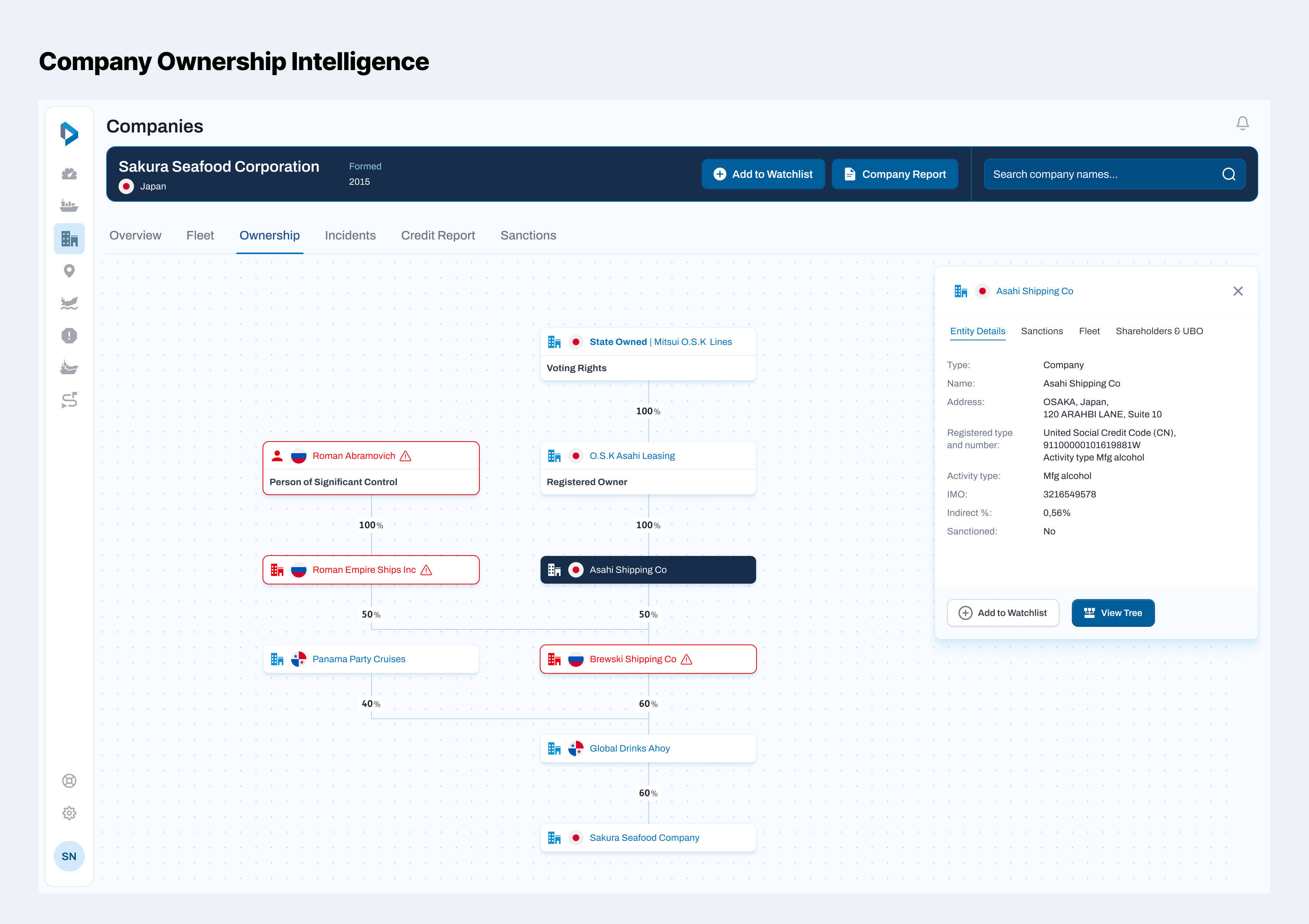 Ownership Intelligence is a new core module in Lloyd's List Intelligence's Seasearcher platform, allowing users to view and analyse the ownership of vessels and companies, as well as the risks associated with them such as sanctioned owners and political exposure.